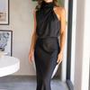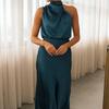 IHUASU Summer Light Mature Temperament Women's Sleeveless Halters Solid Color Satin Dress