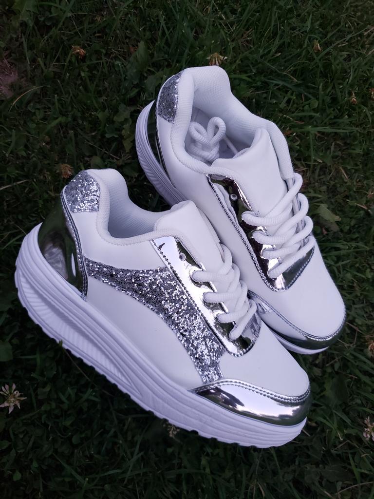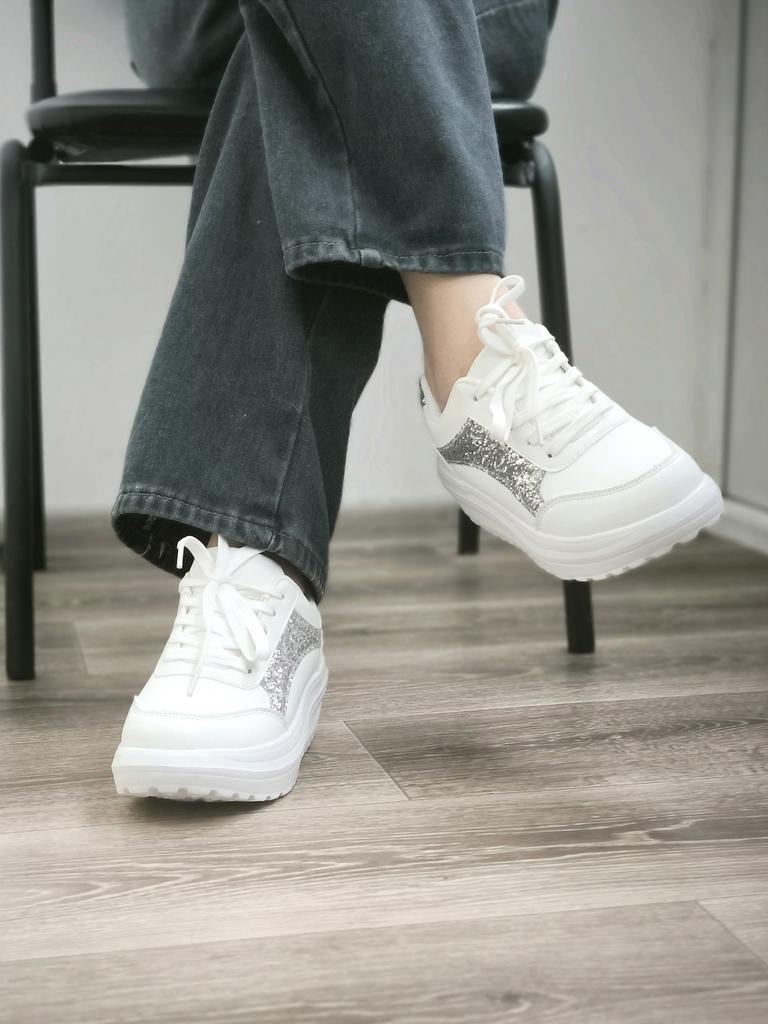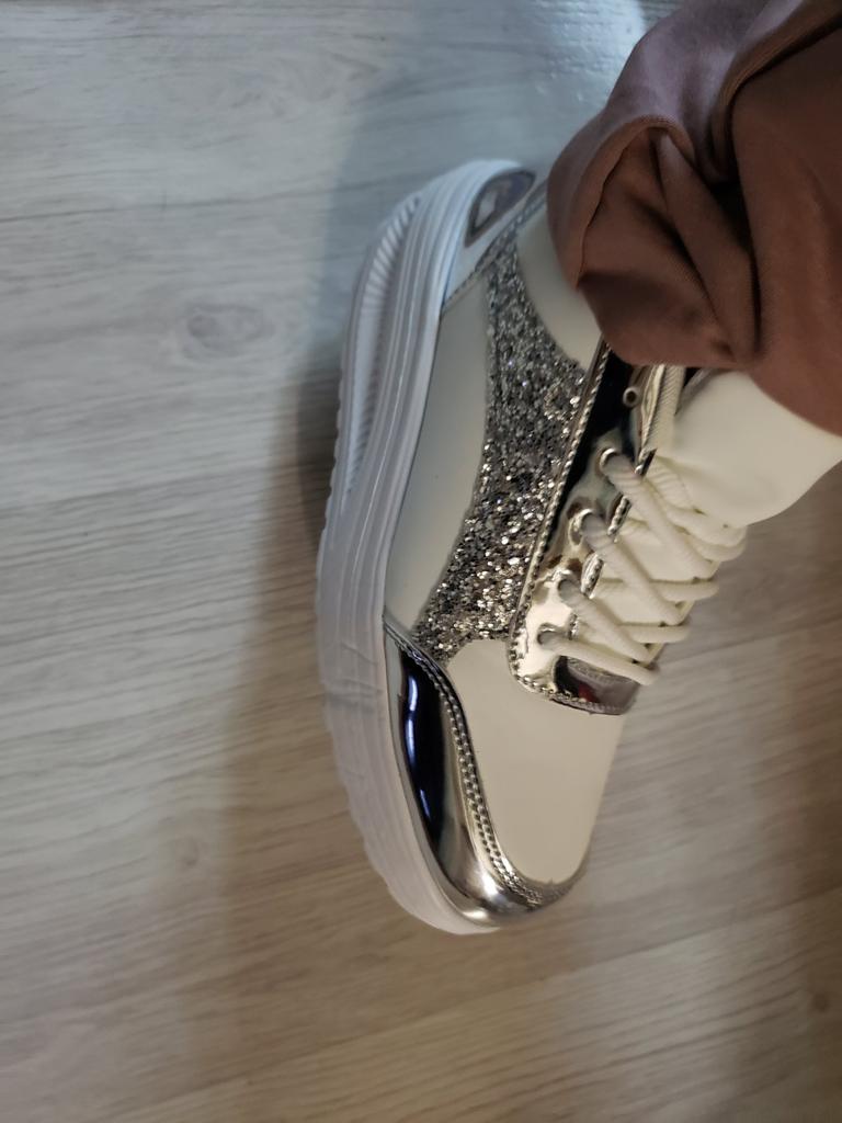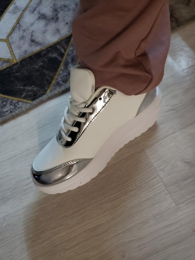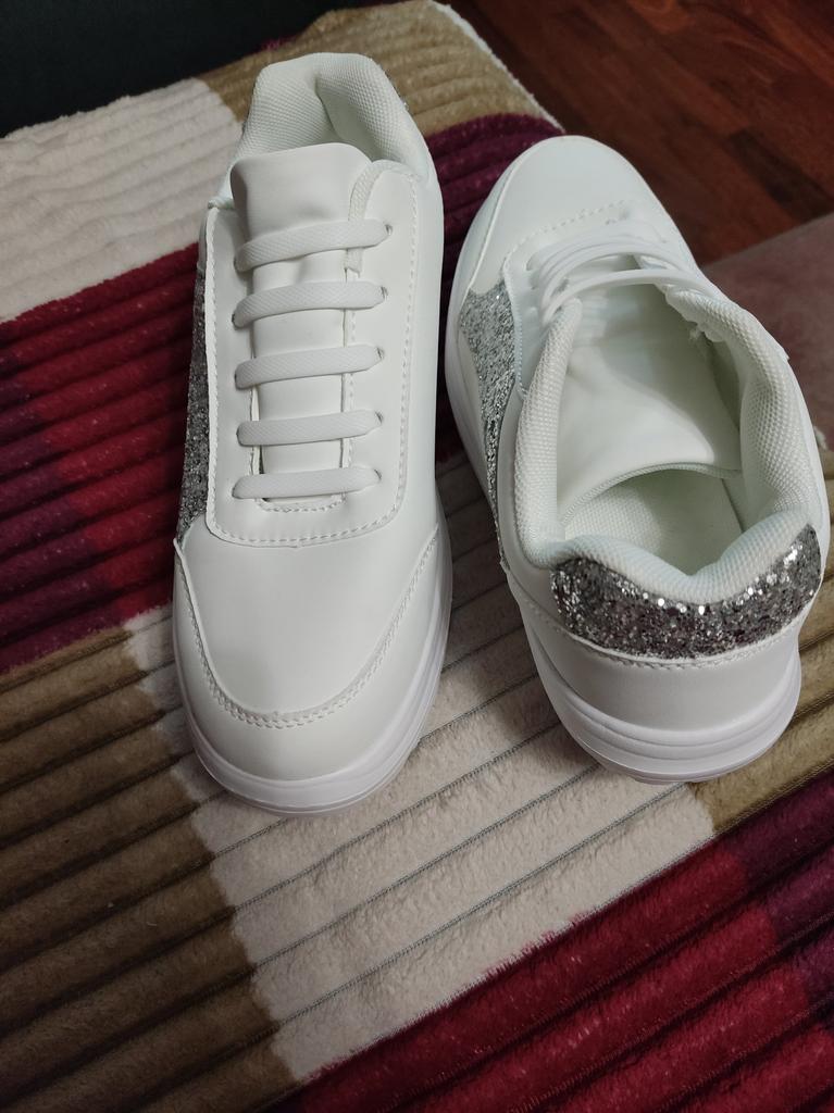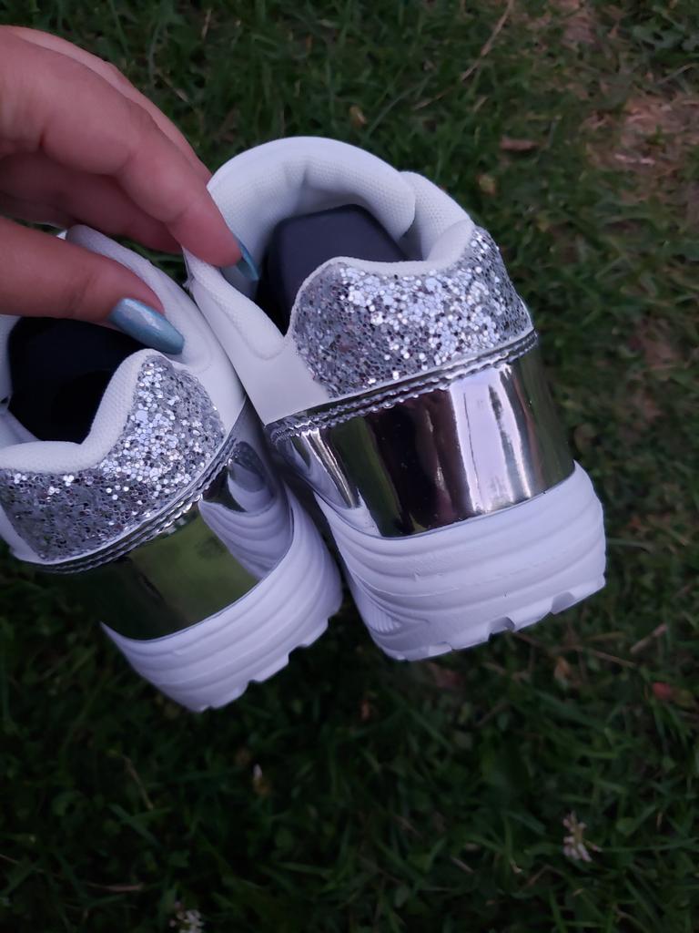 I love my new white sneakers with silver details. They are the most comfortable shoes I have had in a long time. The white and silver design is super elegant and combines perfectly with any outfit, whether casual or more dressed up.. The comfort they offer is incredible. The sole is cushioned and feels like you are walking on clouds. Furthermore, the material is of excellent quality and fits my foot perfectly, providing optimal support.. The silver details give a touch of sophistication and style to the sneakers. Without a doubt, they are the ideal complement to give a touch of shine to any outfit. I love them and I can't stop using them!