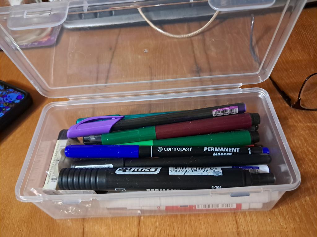 Normal box for markers, felt-tip pens, pencils. Plastic is soft, doesn't smell. Thank you!!!