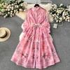 Spring Summer Holiday Flower Print Organza Beach Dress Women's Lantern Sleeve Single Breasted Lace Up A Line Long Maxi Robe