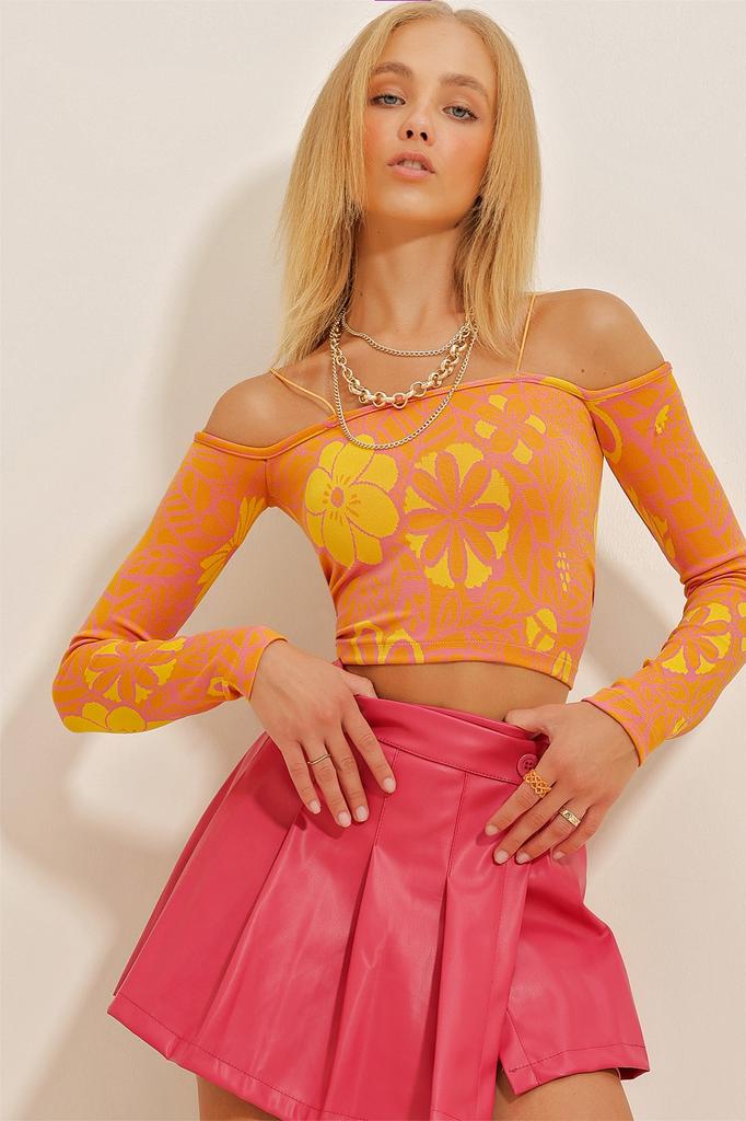 Women's Blouse New Season Fashion Orange Fuchsia Rope Strap Detailed Long Sleeve Patterned Crop Knitted Blouse