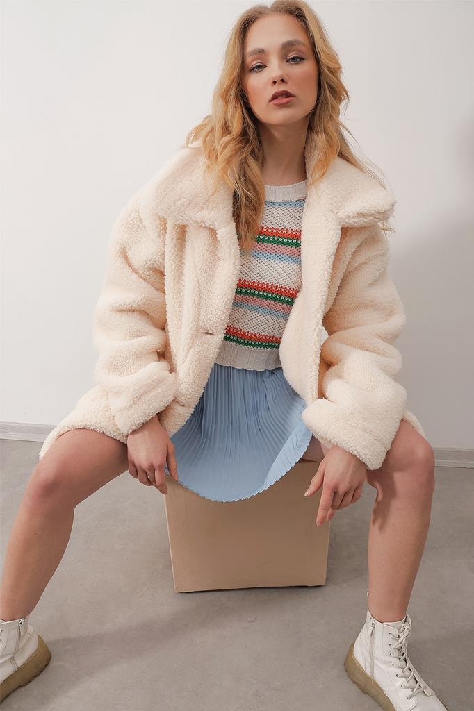 Women's Coat New Season Fashion Beige Polo Collar Double Pocket Buttoned Front Plush Coat