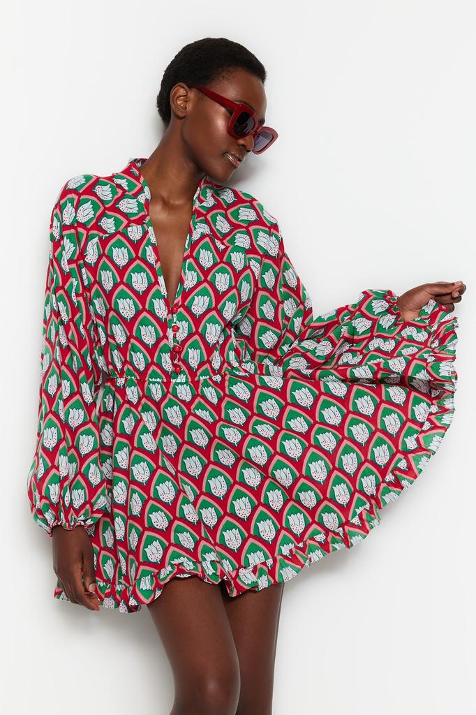 Women's Dress New Season Fashion Geometric Patterned Mini Woven Balloon Sleeve 100% Cotton Beach Dress
