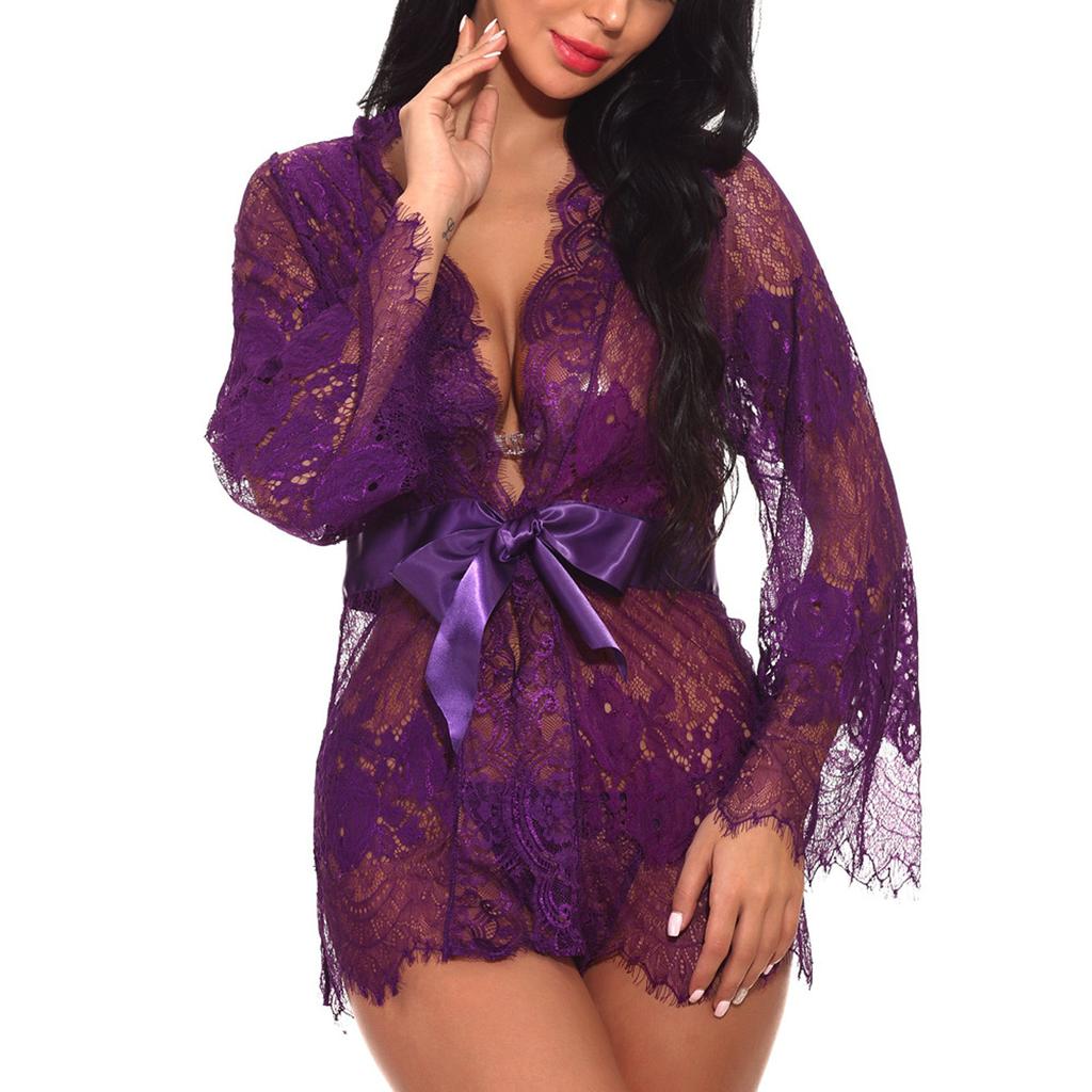 Fashion Women Sexy Dressing Gown Babydoll Lace Lingerie Belt+G-string Bath Robe
