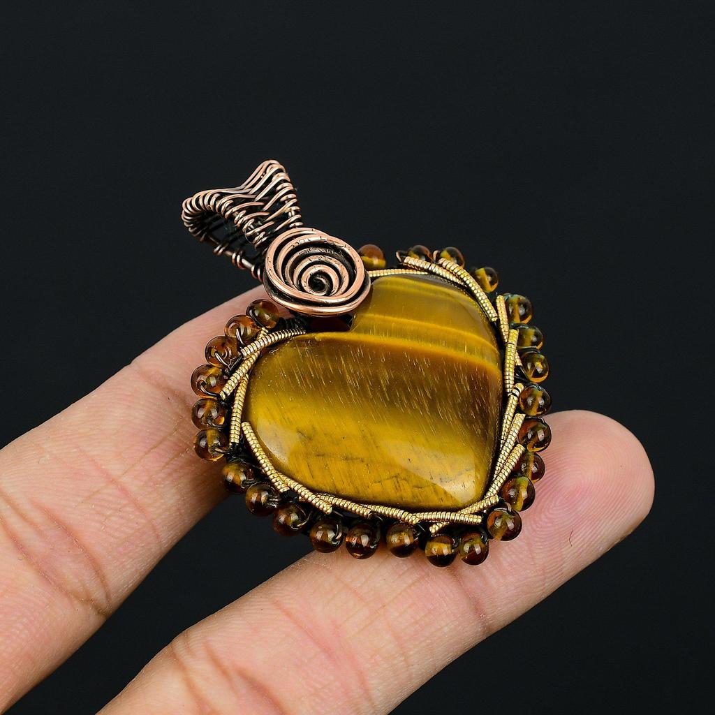 Heart Shape Tiger Eye Gemstone Handmade Copper Wire Wrap Jewelry Pendant For Love
