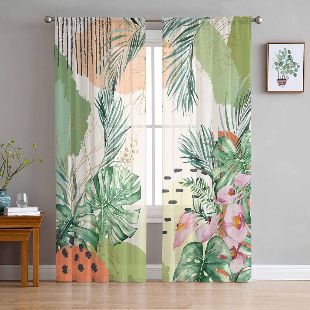 Summer Tropical Palm Leaf Watercolor Window Tulle Curtains for Living Room Bedroom Hotel Luxury Decoration Sheer Curtains