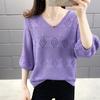 Women's V-neck Hollow Knitted Sweater Loose Bat Sleeve Ladies Top Short Thin Knit Pullovers for Women