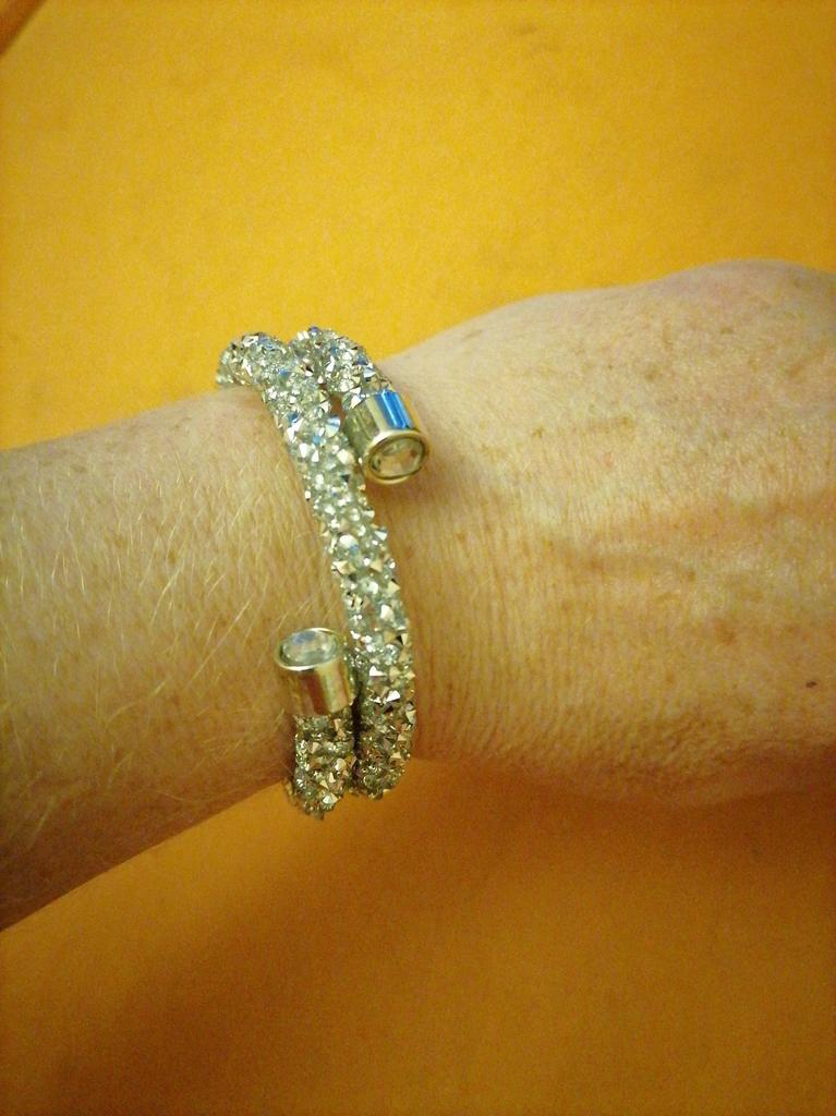 Hmm... the little diamonds are glued to the wire with gel glue, they fall off individually (for use only until they all fall off). The whole thing is a bit scratchy but it shines nicely.