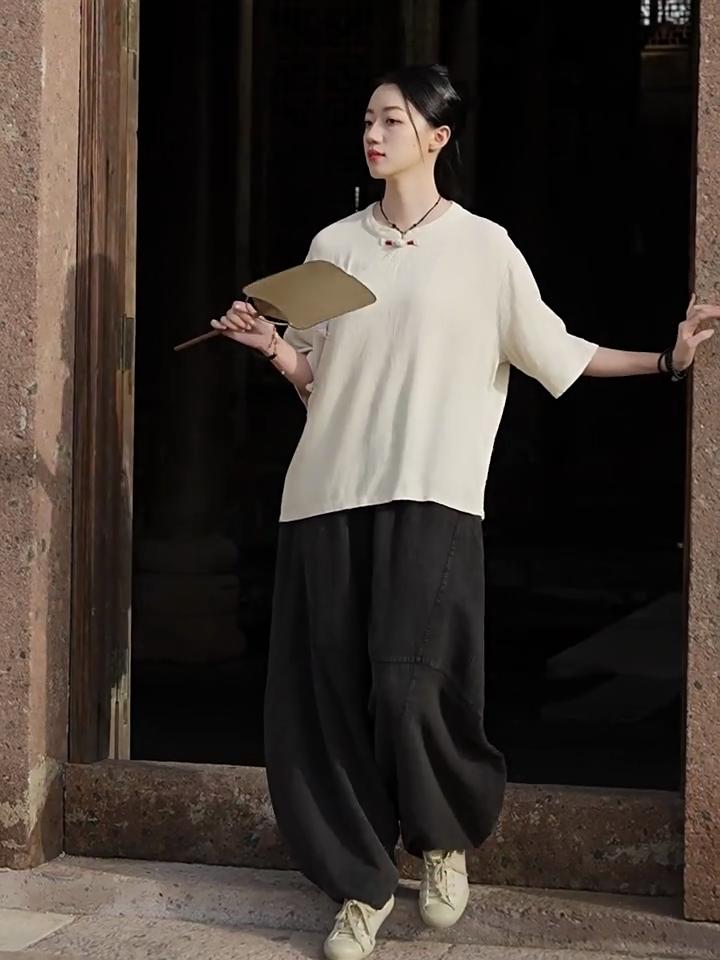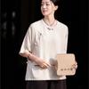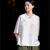 Johnature Women Chinese Style Shirts Solid Color Stand Half Sleeve Tops Summer Vintage Button Women Shirt Blouses