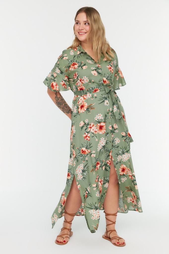 Women's Style Plus Size Green Floral Woven Slit Shirt Dress