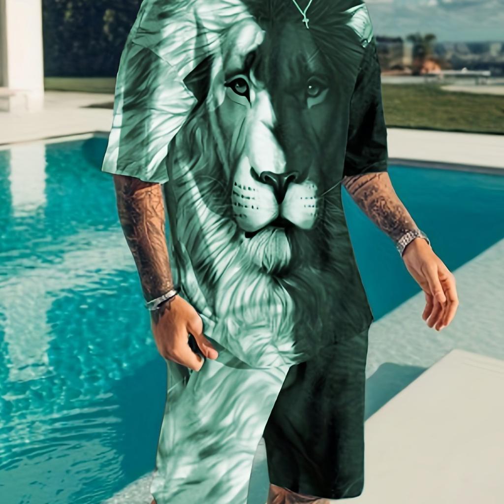 2PCS Plus Size Men's Summer Casual Suit Color Block Lion Print Short Sleeve T Shirt And Track Shorts Set Holiday Lounge Beach Sports Suit