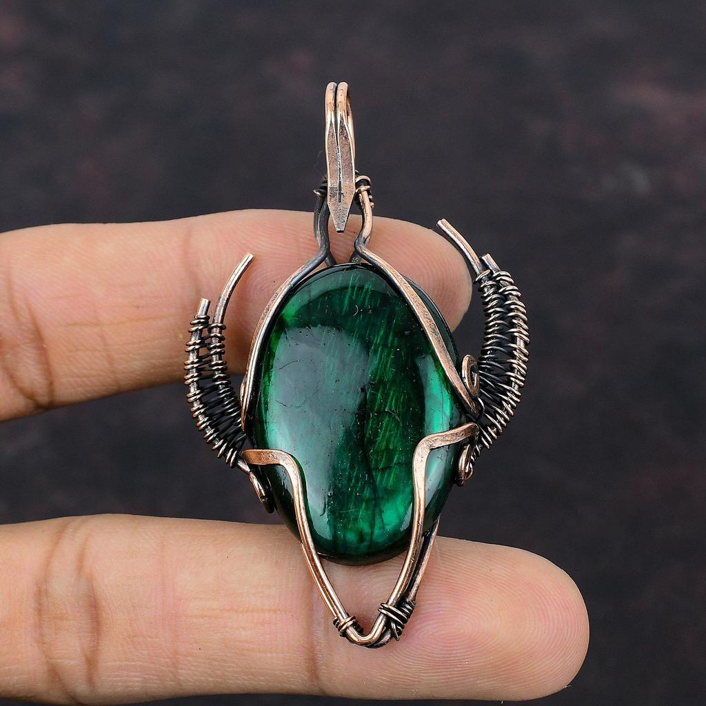 Green Fire Labradorite Pendant Copper Wire Wrapped Jewelry Handmade Pendant Copper Design Bull Face Shape Pendant Wire Wrap Gemstone Pendant