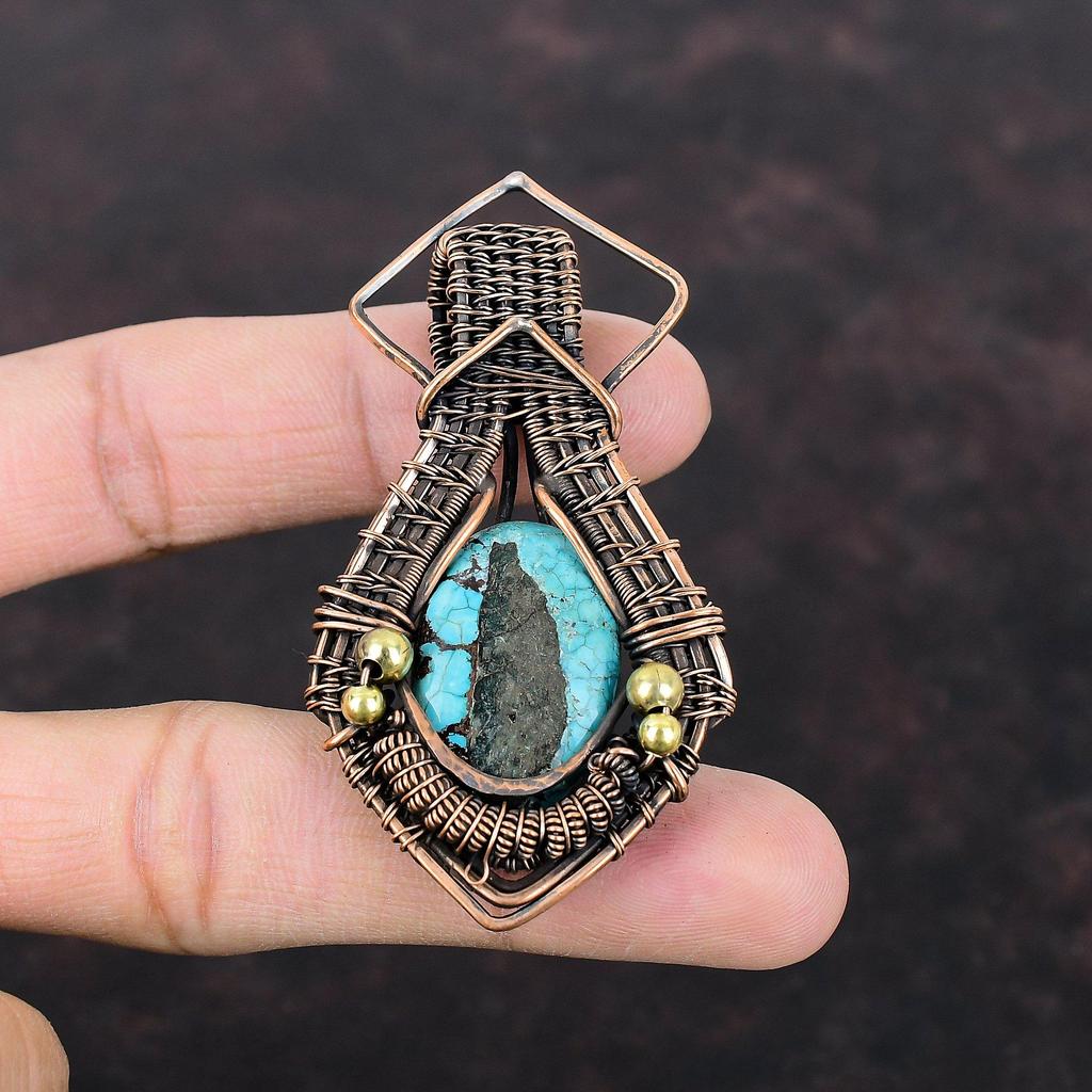 Tibetan Turquoise Pendant Copper Wire Wrapped Pendant Stylish Pendant Handmade Wire Wrapped Jewelry Gemstone Pendant For Gift Copper Jewelry