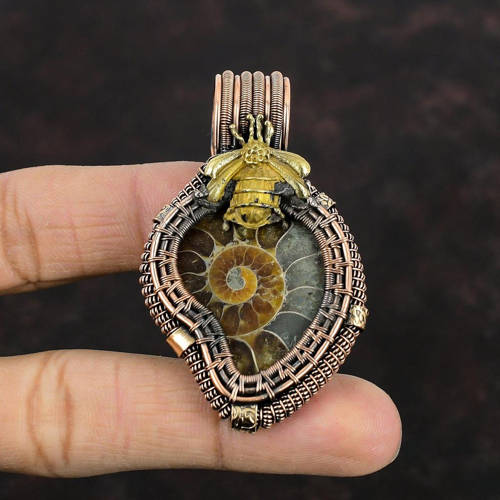 Ammonite Fossil Pendant Copper Wire Wrapped Gemstone Pendant Handmade Copper Jewelry Honey Bee Pendant Unique Wire Wrap Jewelry Gift For Him