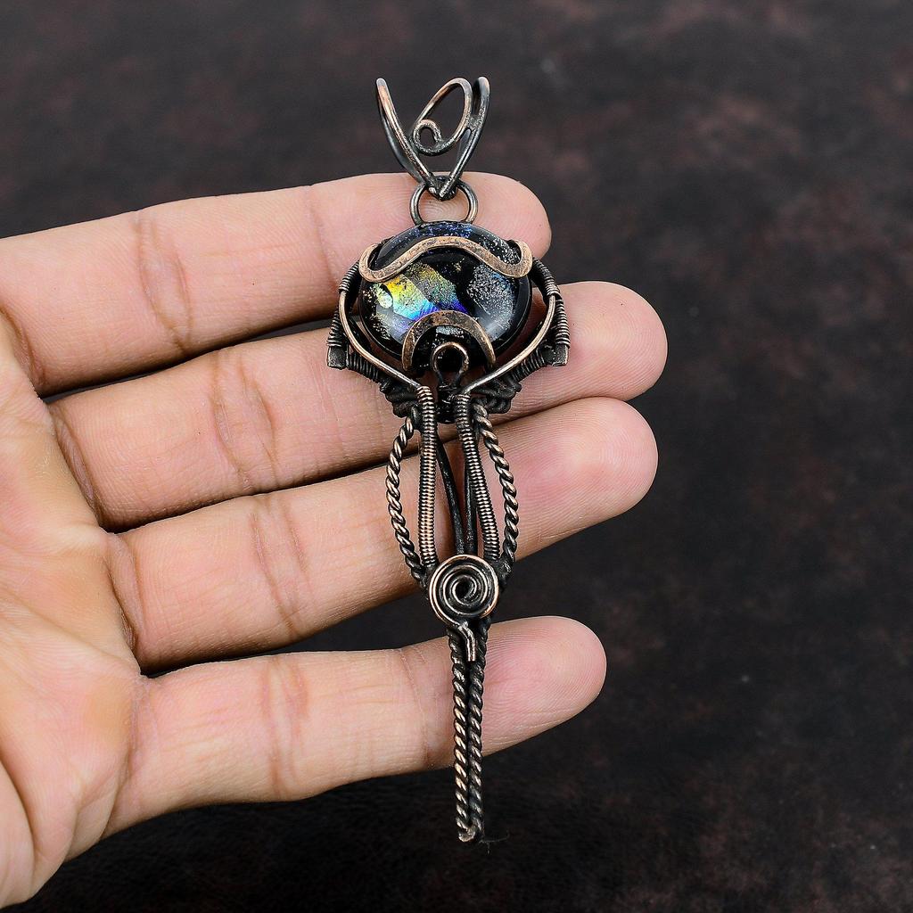 American Dichroic Glass Pendant Copper Wire Wrapped Gemstone Jewelry Stylish Pendant Handmade Jewelry Copper Wire Wrap Pendant Gift For Mom