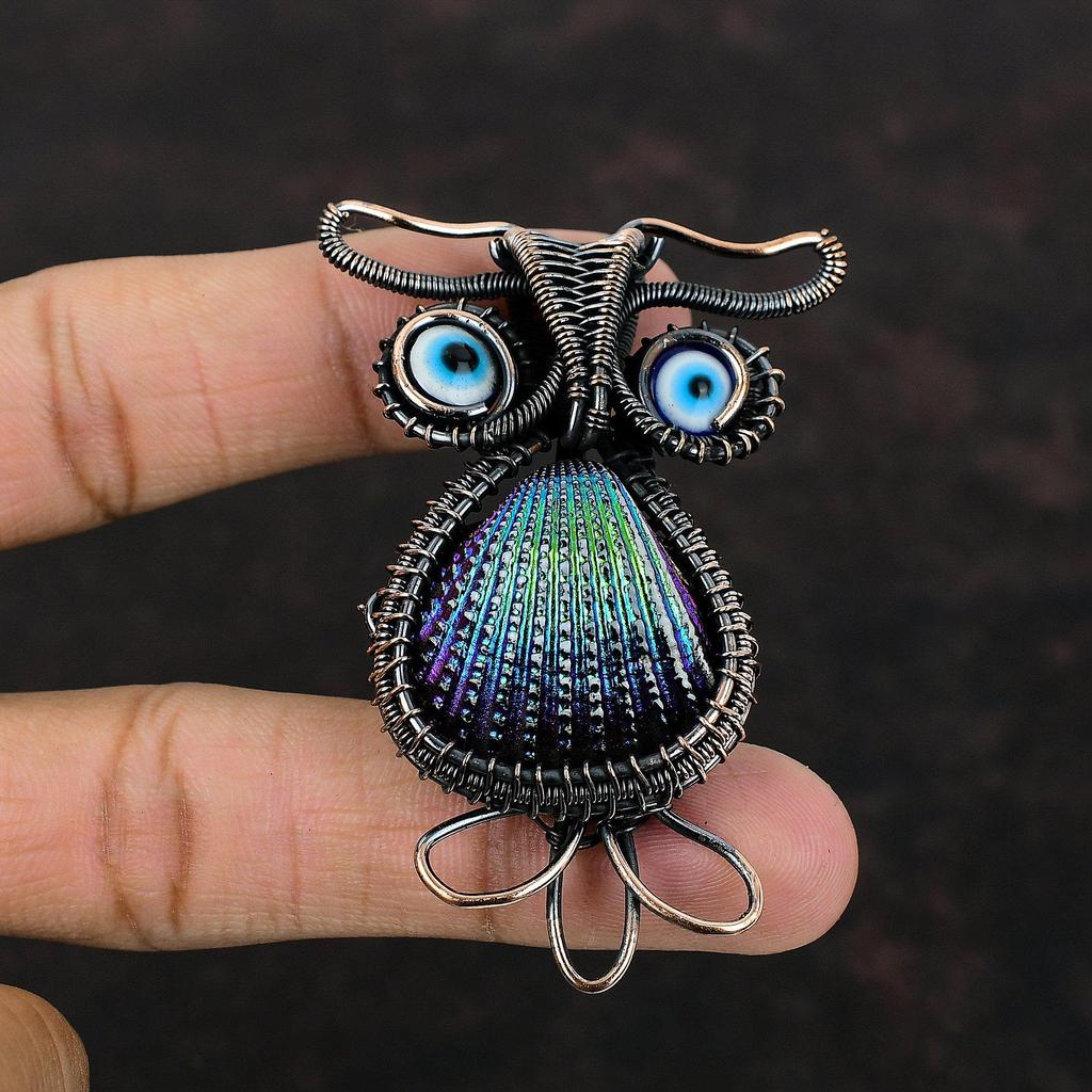 Titanium Coated Shell Copper Pendant Blue Color Evil Eye Pendant Wire Wrapped Gemstone Pendant Owl Pendants Handmade Copper Designer Jewelry