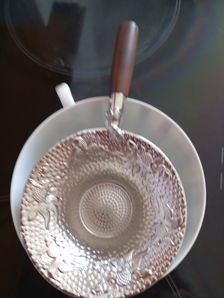The tea strainer is very nice - beautiful: the strainer itself is like silver, shiny, and the handle is wooden. The quality is good. I am very satisfied with the purchase. I recommend it.