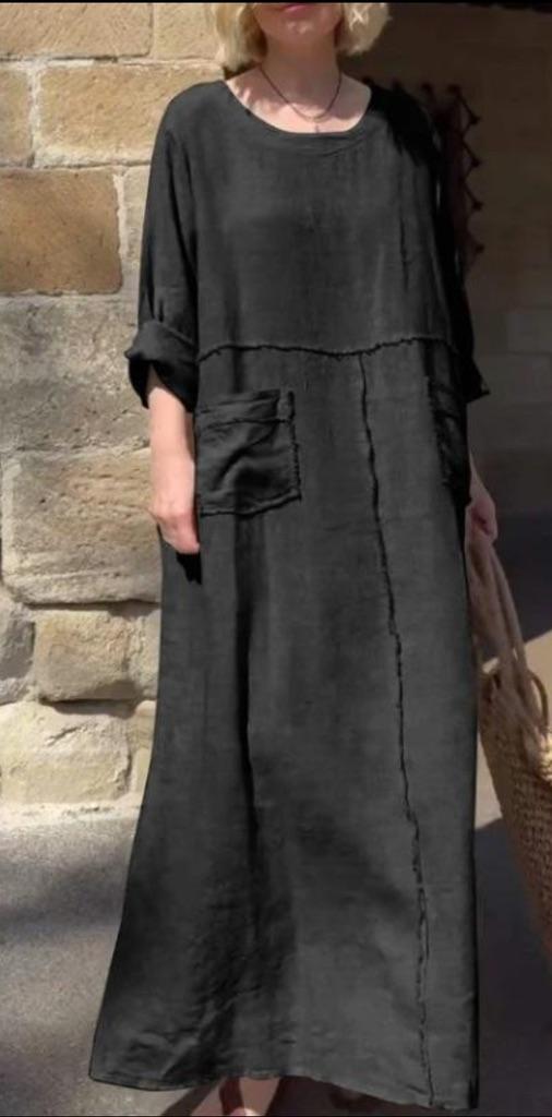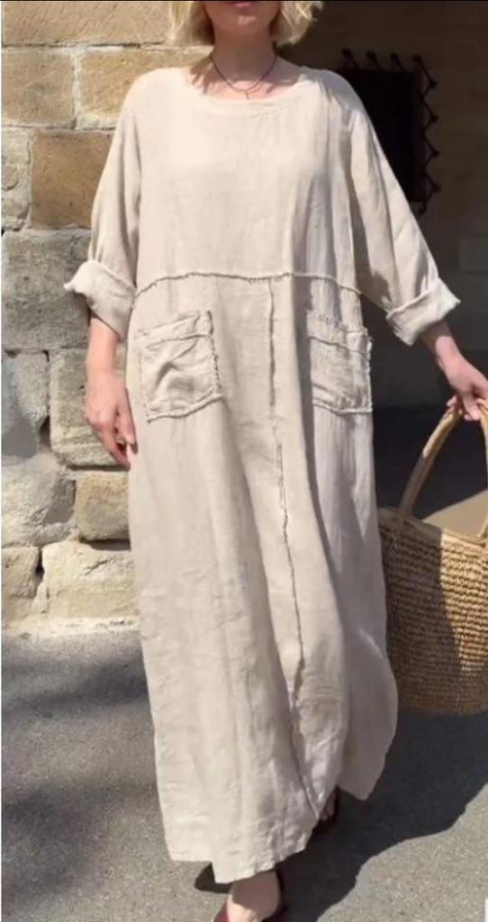 Women's Solid Color Long Sleeve Round Neck Cotton and Linen Casual Pleated Double Side Pockets Loose Long Dress Clothes Sale