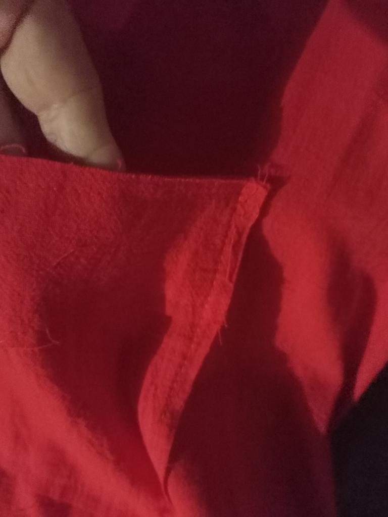 The fabric composition is stated as cotton, linen, but in reality it is cotton, polyester. In addition, the seams on the inside of the front and back are not processed.