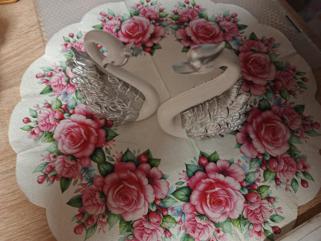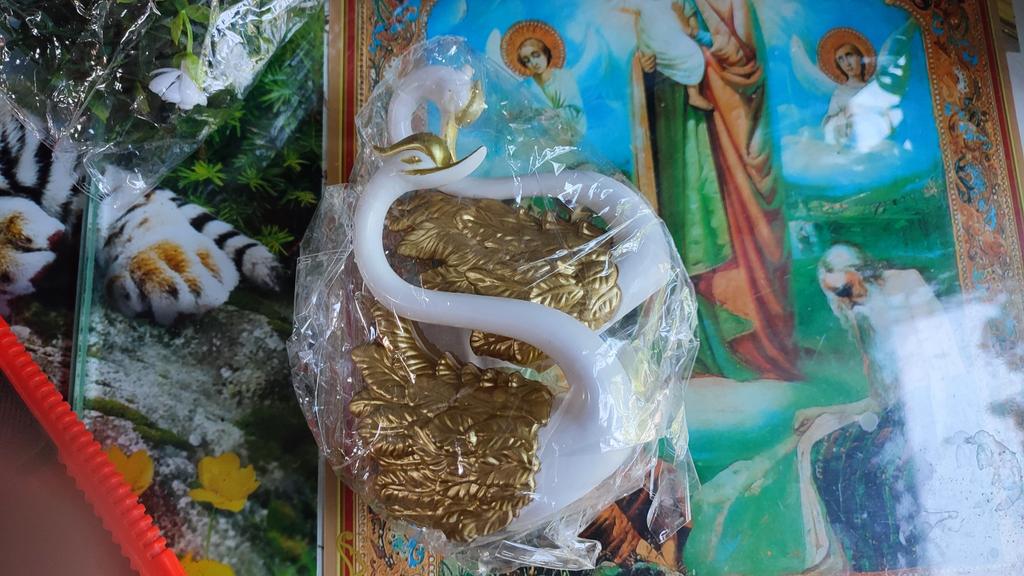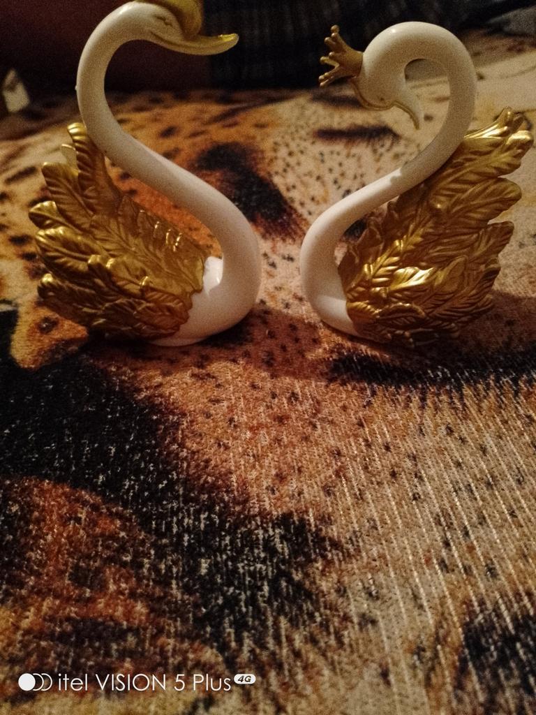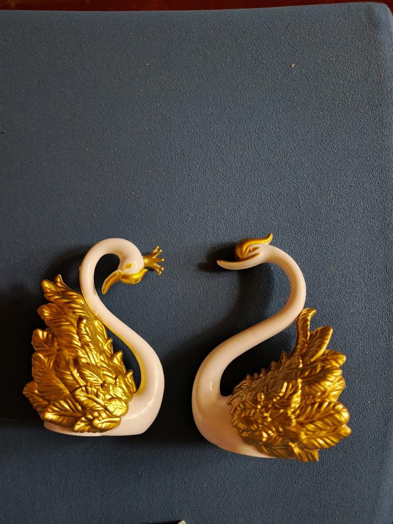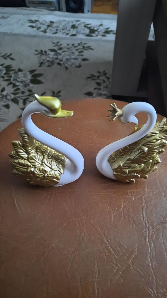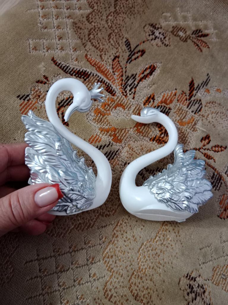 One swan is missing a crown, requires repainting. Otherwise, they are not bad plastic, detachable birds. All details are removable: wings, crown, and the swan itself comes apart in half.