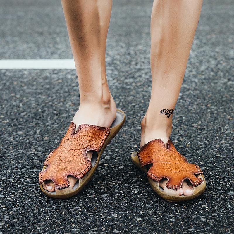 These summer sandals are designed for men seeking comfort and style during outdoor and beach activities. Crafted with a cow leather upper, they offer durability and a sophisticated look. The TPR sole provides excellent grip and flexibility, ensuring a comfortable stride. Available in large size 48, these warm, soft-soled half slippers are perfect for those with larger feet, combining practicality with a modern design.