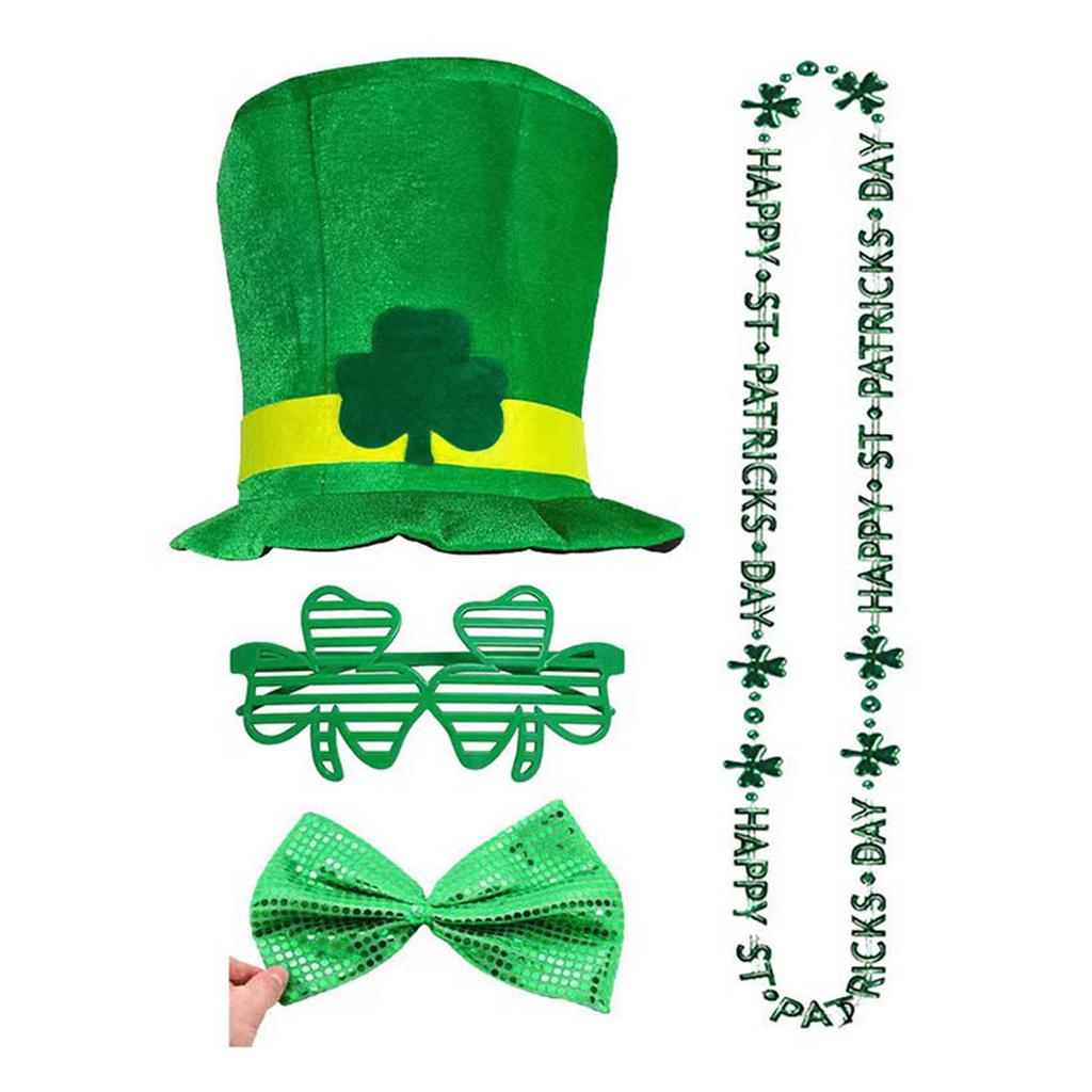 Green Tall Hat for Saint Patrick Day with Eyeglasses Festival Decor Irish National Day Flat Top Hat Costume Accessories