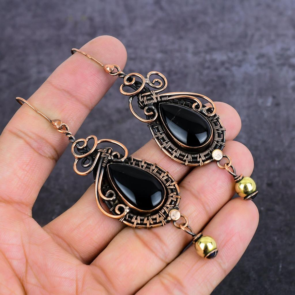 Natural Black Tiger Eye Gemstone Copper Wire Wrap Jewelry Earring 3.59" U8p96