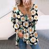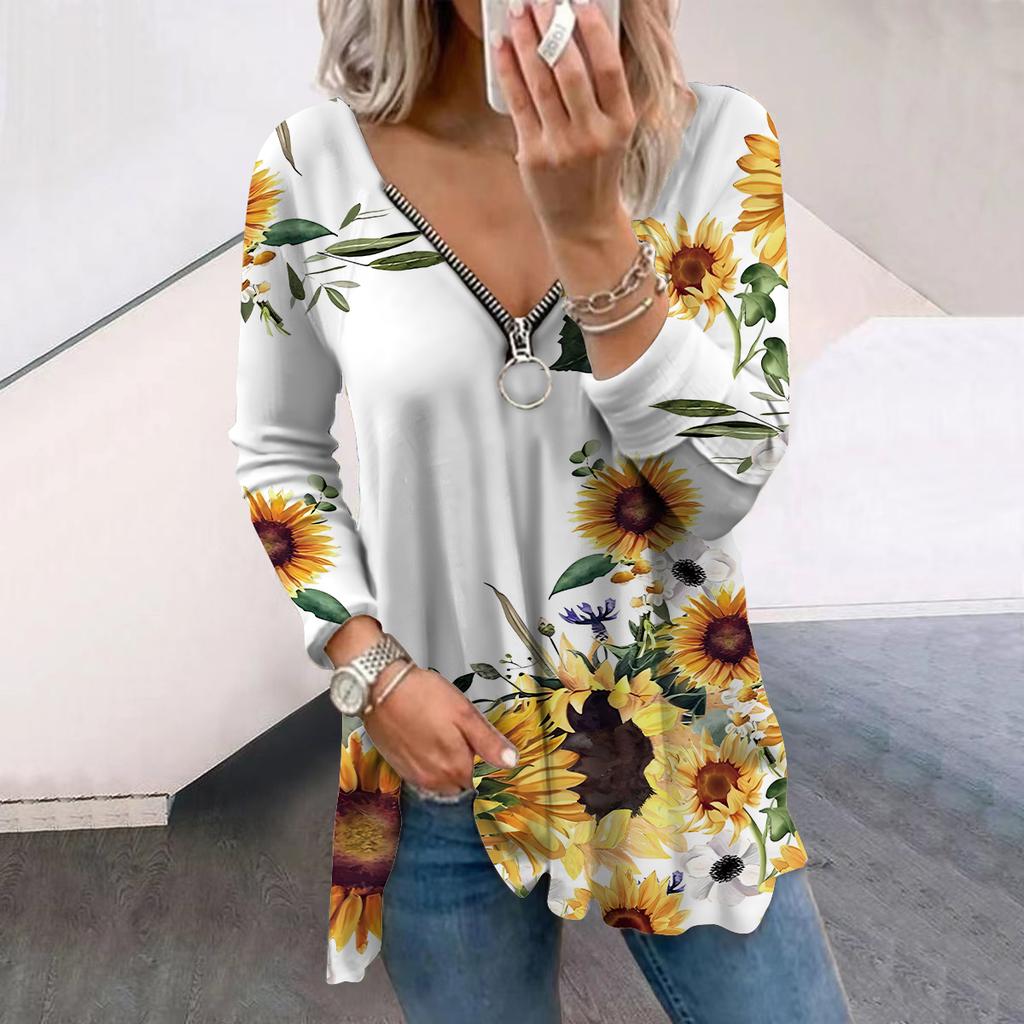 Women Autumn Floral White Sunflower Printed Long Sleeve T-Shirts Loose V-Neck Plus Size Tee Shirt Tops Comfy Blouse