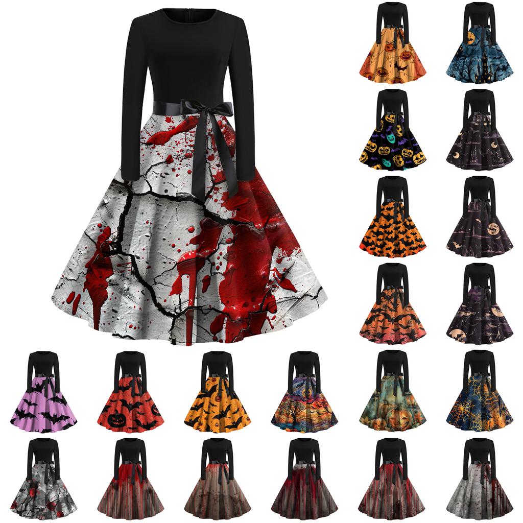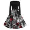Halloween Print Flare Dress For Women Long Sleeve Dress Hollow Party Casual Round Neck Dresses