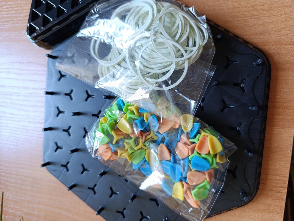 Everything is intact. The tiles for the colored figures are of very poor quality, if you have bought candies in a box at least once, then they are made of the same material, but of significantly worse quality, they are see-through. One careless movement and into the trash. The rubber bands are ordinary, stretch well, the colored figures themselves are of very pale colors, not as bright as in the sample.