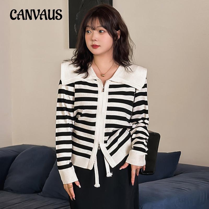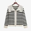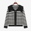 Plus Size Women's Autumn Navy Collar Jacket Top Striped Long Sleeve Knitted Cardigan