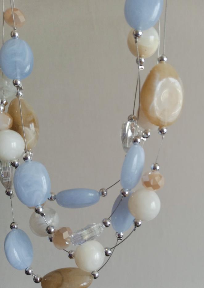 The necklace consists of four strands with beads. Three strands are made of the same length, so all the beads are on top of each other. It's not pretty! It doesn't look like this in the photo.