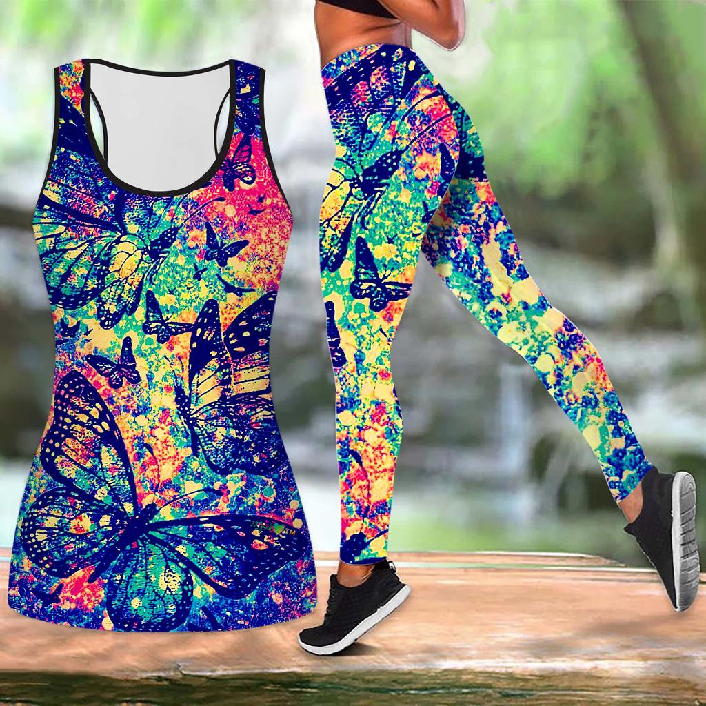 Hollow Butterfly Print Yoga Outfit for Women Fashion Workout Leggings Fitness Sports Casual Yoga Set Sports Suit