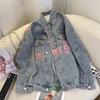 IHUASU Women's Autumn and Winter Letter Printed Graffiti Denim Jacket Designed Loose Long Sleeve Jacket Top
