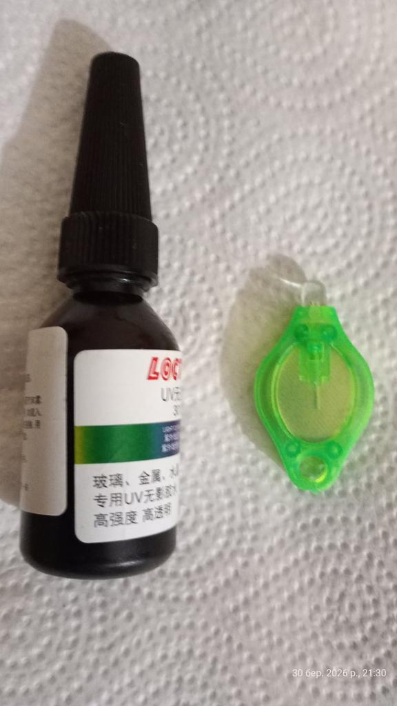 Ordered the item on 06.02, it arrived on 29.03. Judging by the sticker, drunk Chinese people made it. The UV flashlight barely shines. I'll check the glue and add to the review later.