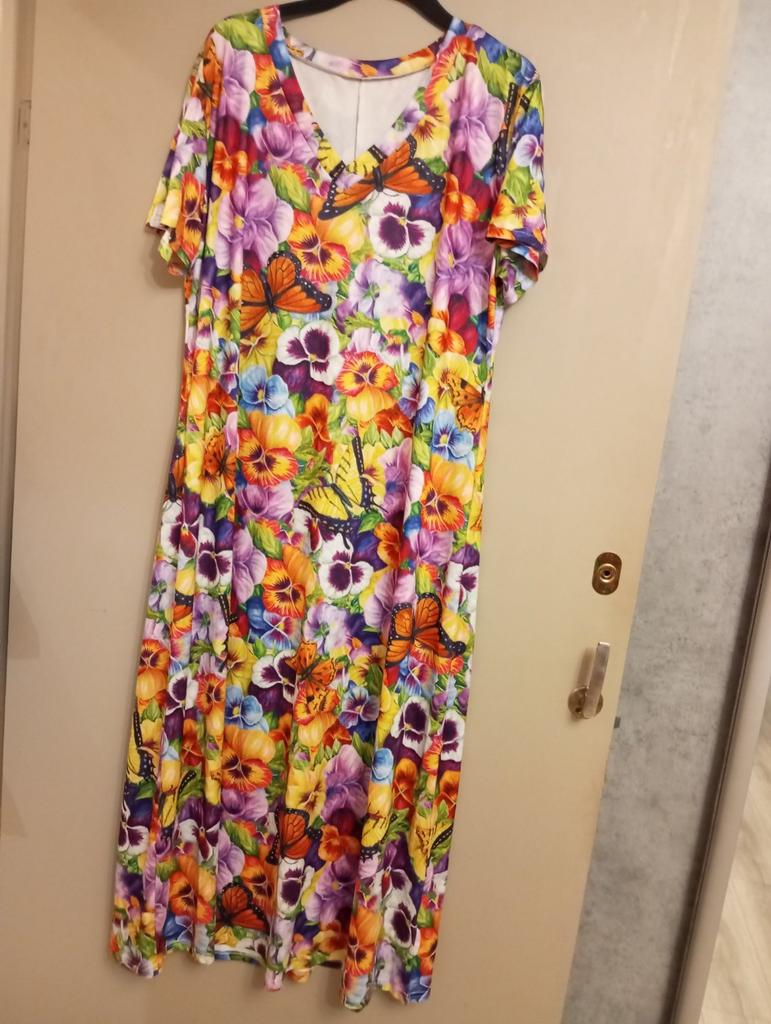 Bright, pleasant to the body, unfortunately synthetics but sewn well, long in the summer, sorry, you can go out for a walk only wearing this dress, bright pattern, so spring, so juicy, I recommend it to girls, very pretty thing
