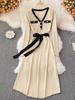 Autumn Elegant Knitting V-neck Long Sleeve Dress Women Fashion Retro Lace Up Bow Dresses Female France Warm Thin Slim Knit Dress New