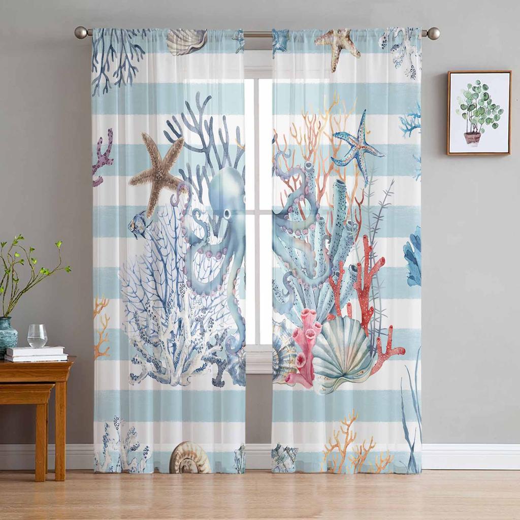 Ocean Blue Striped Coral Starfish Shell Conch Octopus Sheer Curtains for Kids Living Room Voile Window Curtains Tulle Drapes