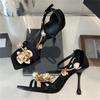 Fashion Luxury Metallic Flower Design Thin High Heels Women Sandals Sexy Open Toe Buckle Strap Stripper Banquet Shoe Elegant Women Pumps