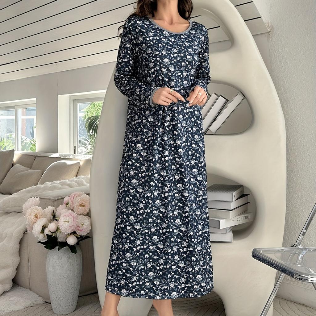 Milk Silk Pajamas Floral Dress Round Neck Long Sleeve Women's Dresses Soft Skin Friendly Dress