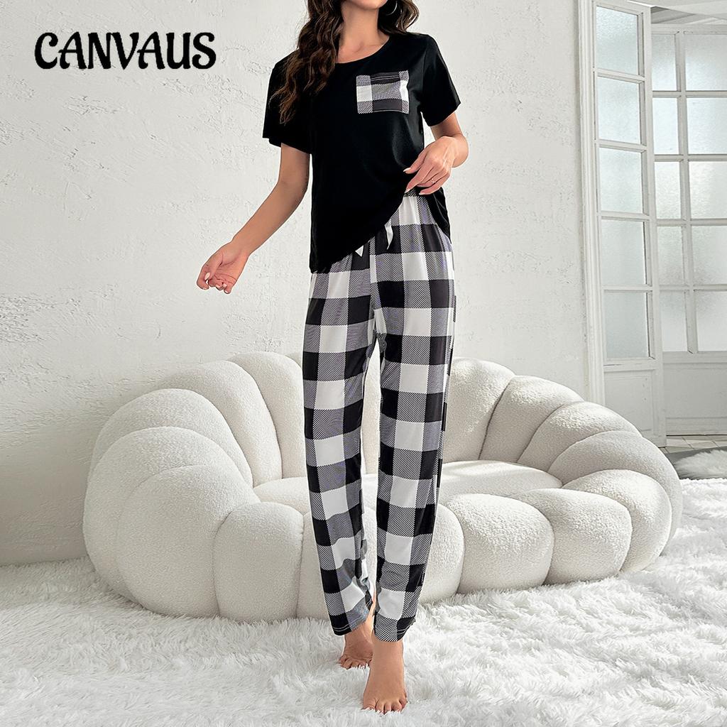 Summer Milk Silk Short-sleeved Pyjamas Women's Plaid Printed Trousers Home Wear Can Be Worn Outside The Thin Section of The Pajama Trousers