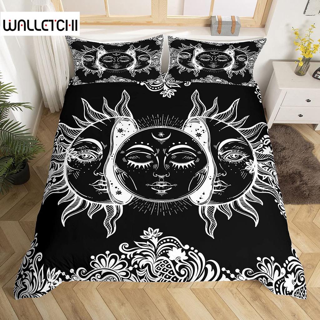 Mandala Duvet Cover Set Sun and Moon Comforter Cover Ties Exotic Style Black and White Botanical Floral Polyester Bedding Set
