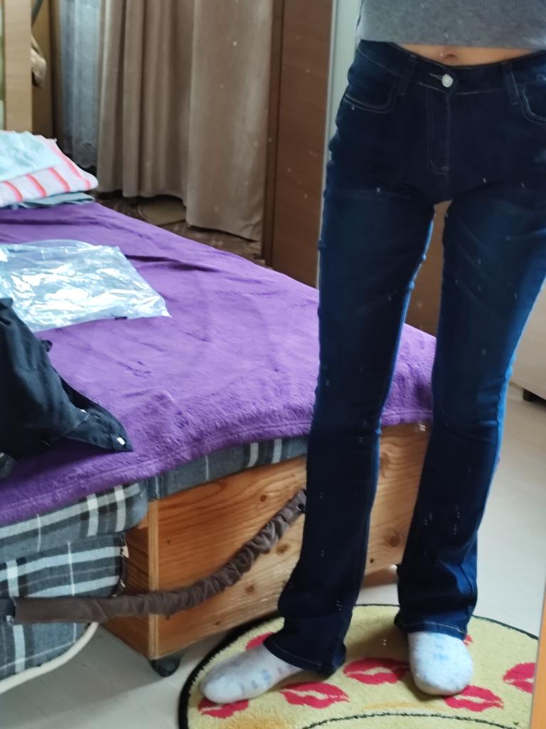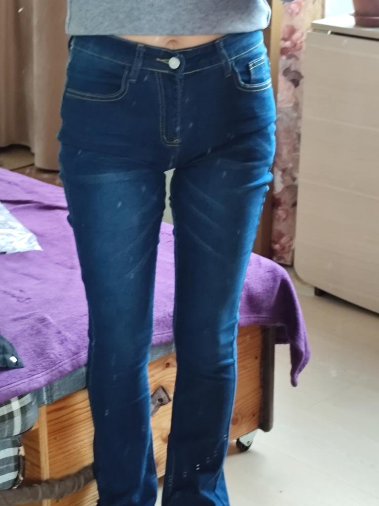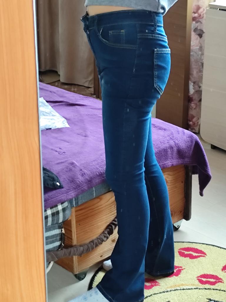 I recommend taking a size smaller, as they stretch, the color is simpler without color gradations, just dark blue, slightly flared.