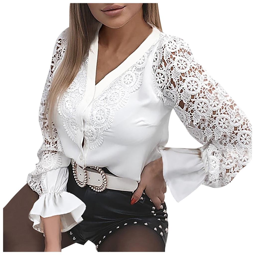 Ladies Fashion Lace Long Sleeve V-neck Round Neck Lace Button Shirt Shirt