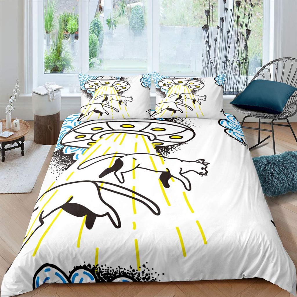 Cartoon Cat Duvet Cover Spaceship Outer Space Pet Animal Golden Line Cover for Kid Boys Girls Youth Gifts for Bedroom Decoration