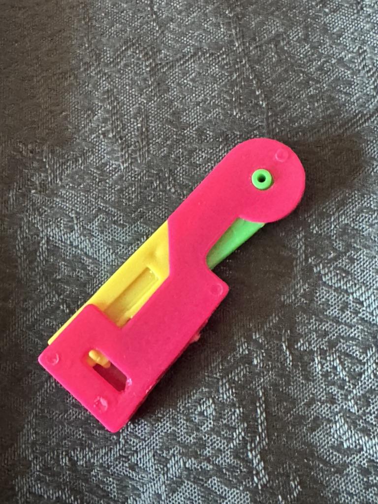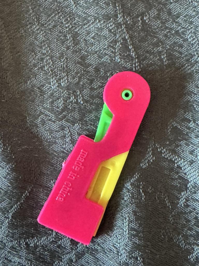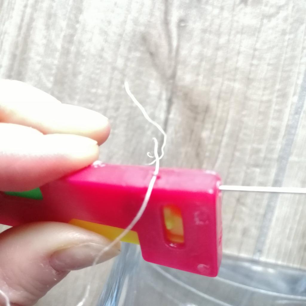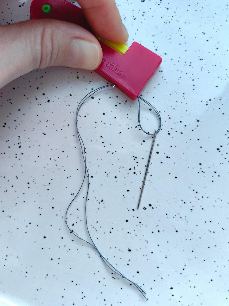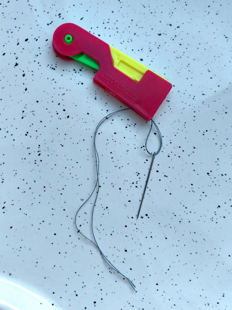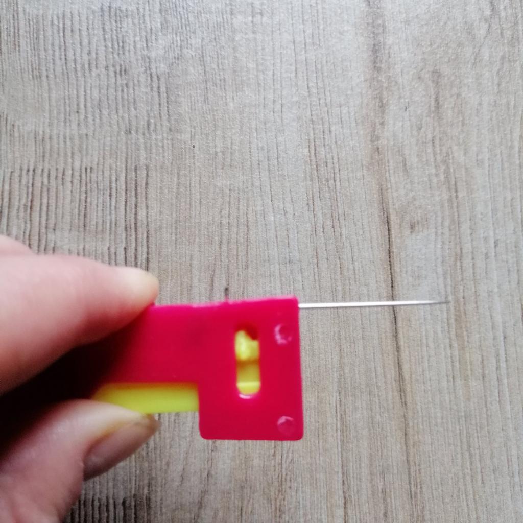 THREAD THE NEEDLE useful tool when sight no longer helps us thread the needle. Completely made of plastic. It takes a moment to understand the mechanism but it works perfectly. 1 Insert the needle from the eye side into the side hole. 2 Push the yellow part, you will see a small hook come out, place the thread there (above the hook) 3 release the yellow button and remove the needle. Recommended purchase.