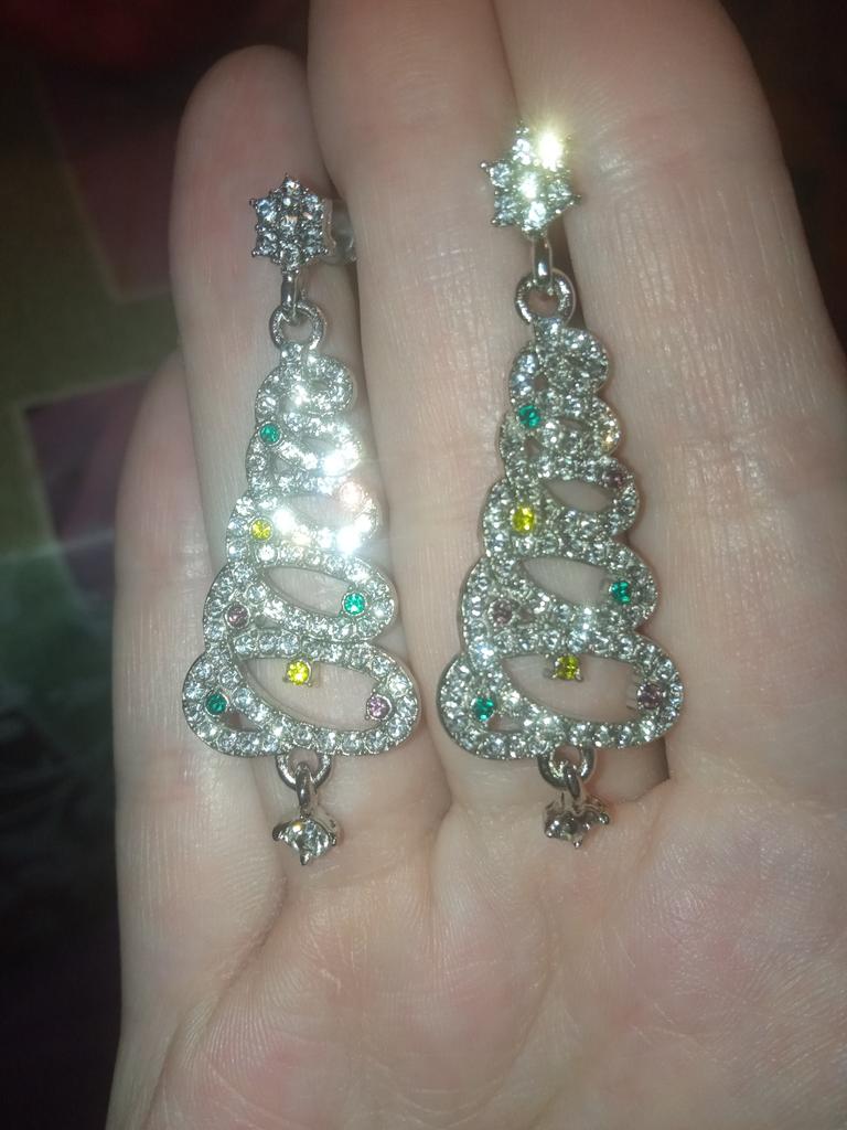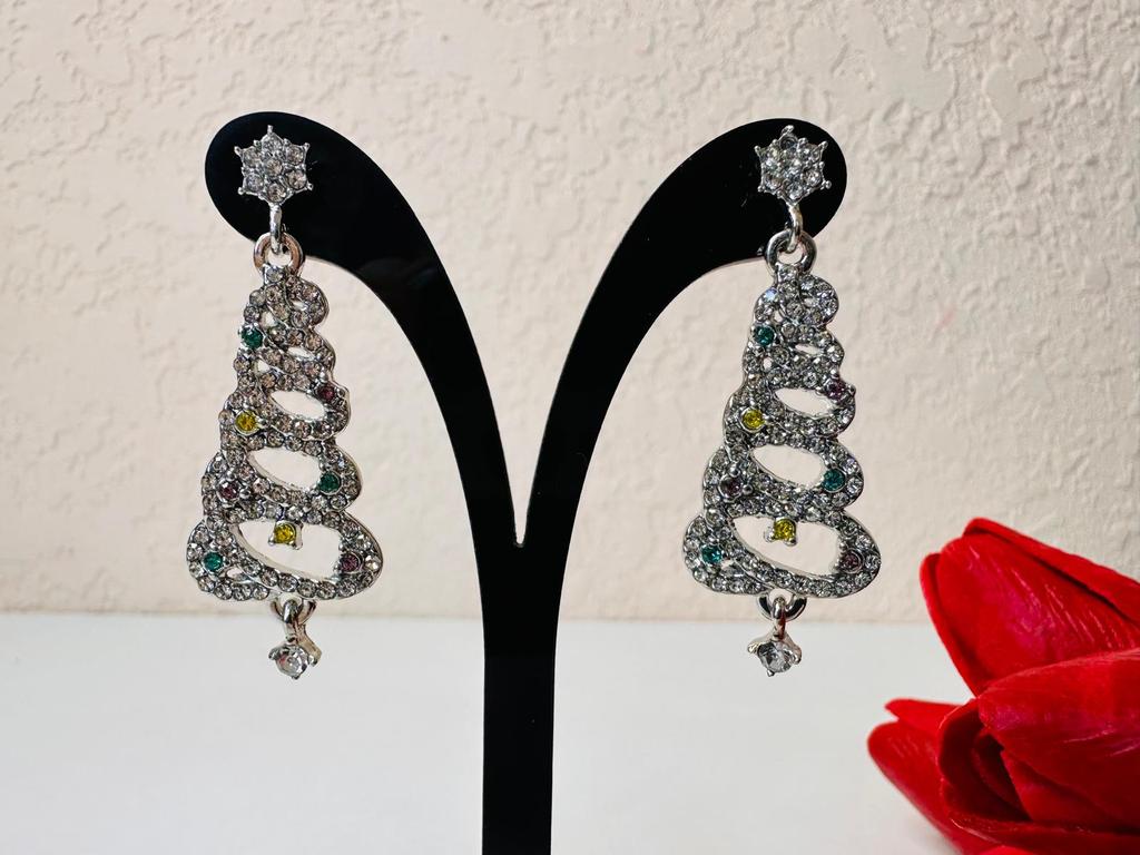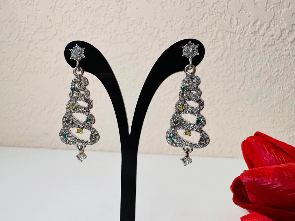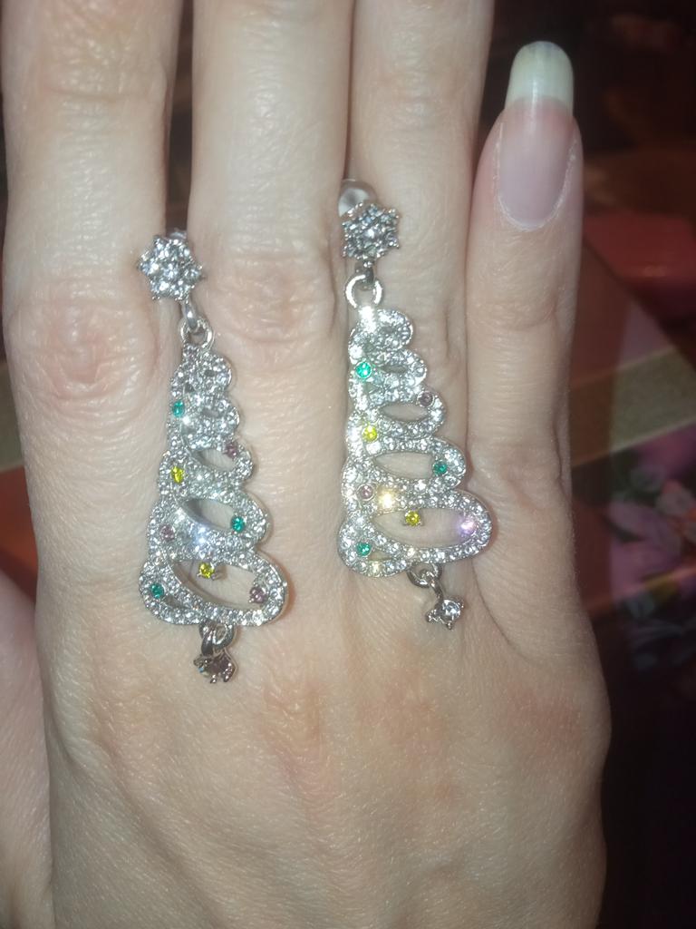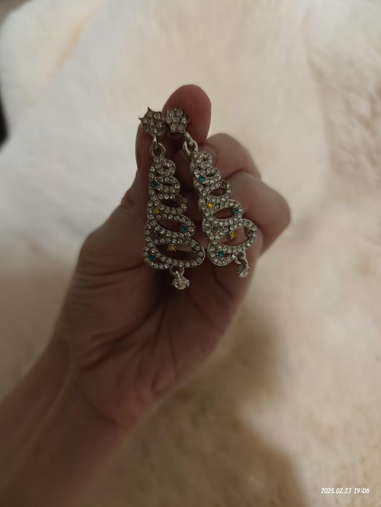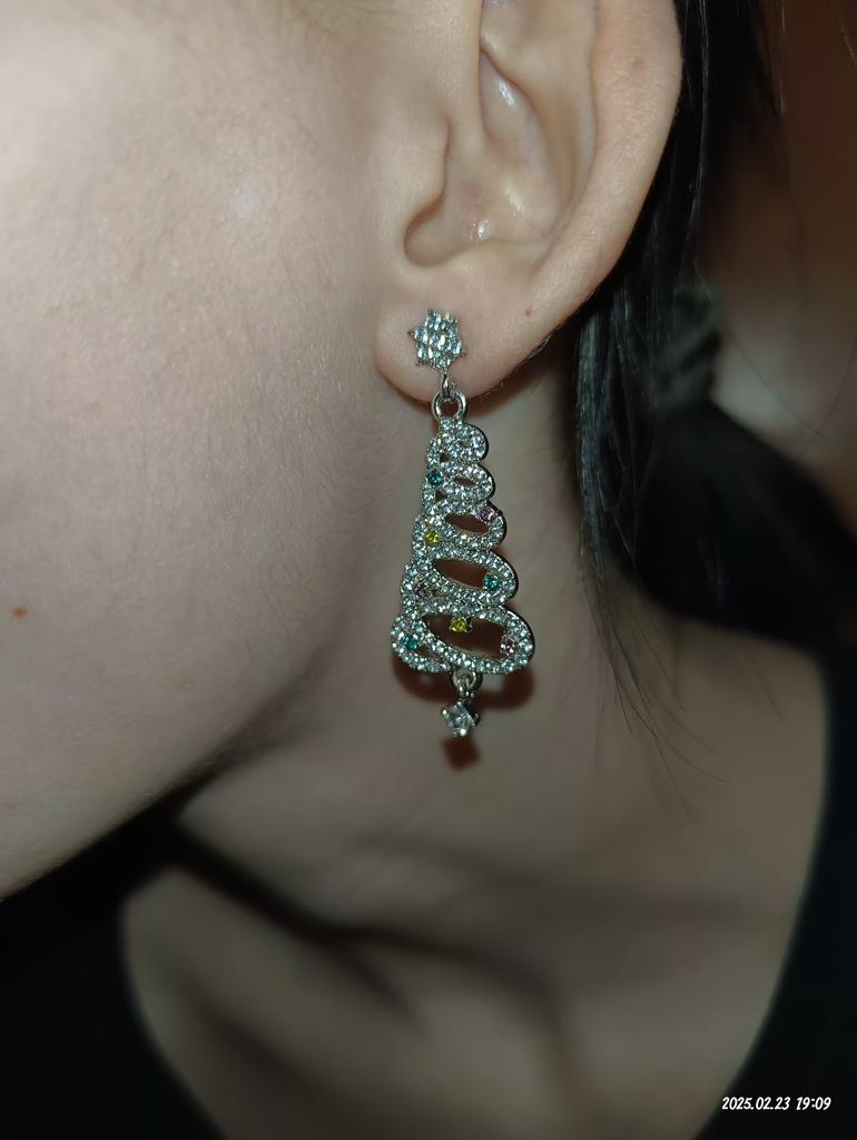 EARRINGS Gorgeous Christmas Tree Earrings with Crystals. They arrived in Italy with tracked shipping in 14 days in a combined package. Well packaged in a bubble wrap envelope they arrived intact. Packaging: plastic wrap In silver color metal in zinc alloy. Firm silicone back closure. They are not heavy despite their large size. They are about 5 cm long. No defects or glue stains. The crystals are well positioned, firm and extremely bright. Recommended purchase 👌