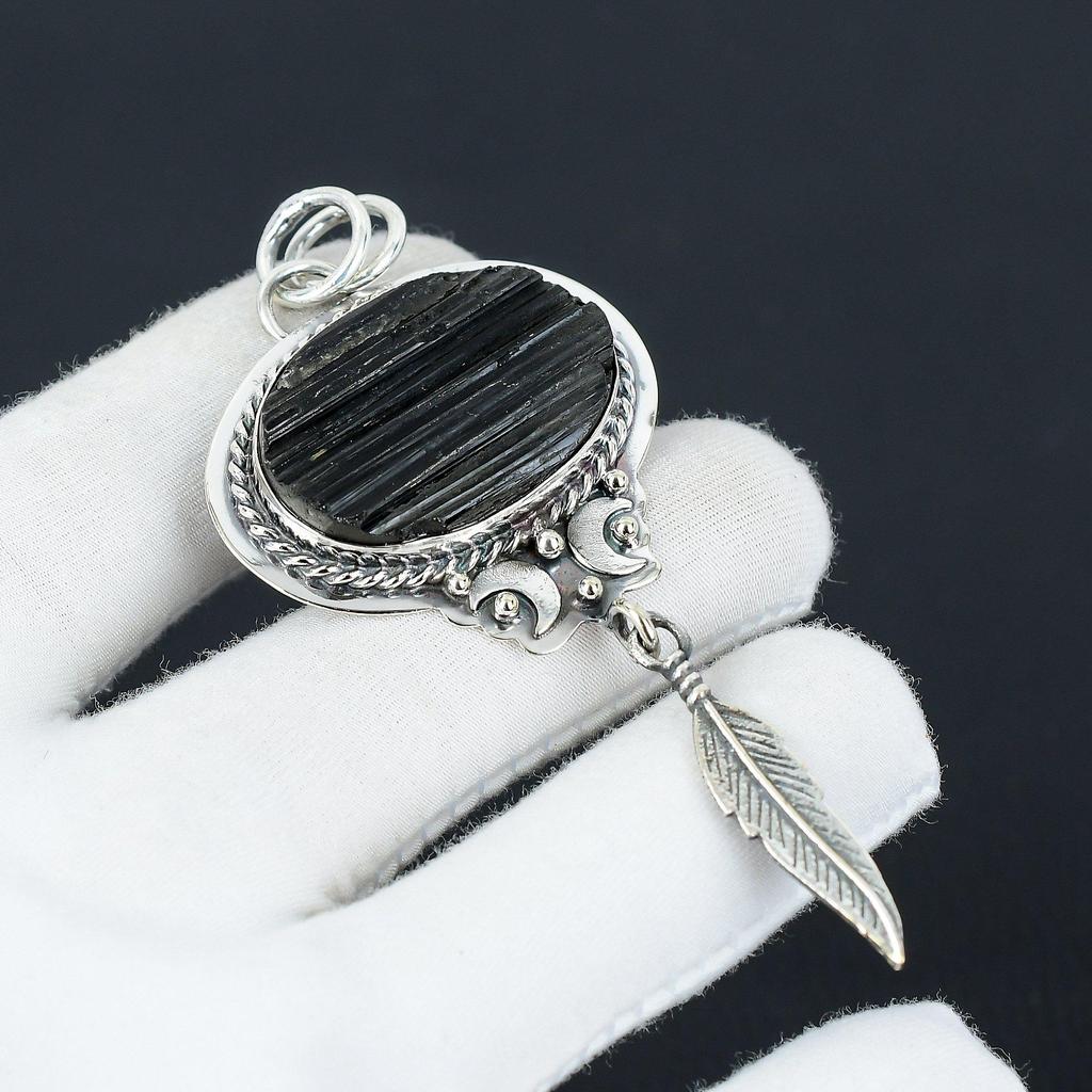 Handmade Black Tourmaline Pendant with Feather Charm In 925 Sterling Silver – Perfect Christmas, New Year, or Holiday Gift for Her