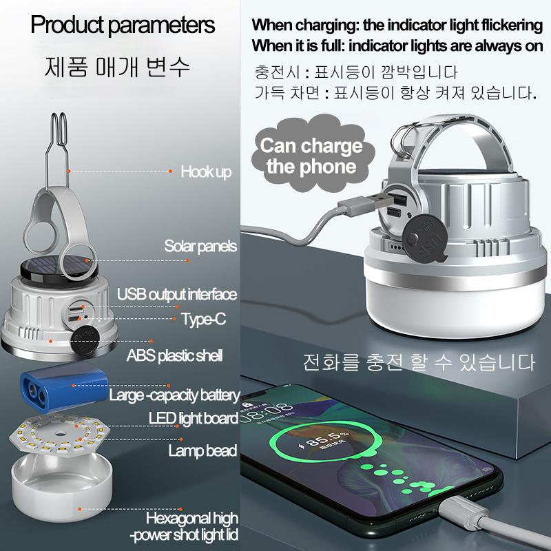 LED Solar Camping Light USB Rechargeable Tent Lamp Portable Waterproof Camping Lantern with Hook Portable Flashlight for Outdoor