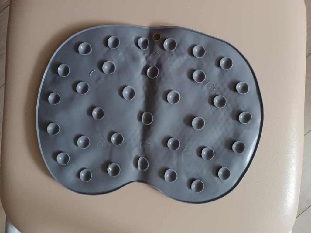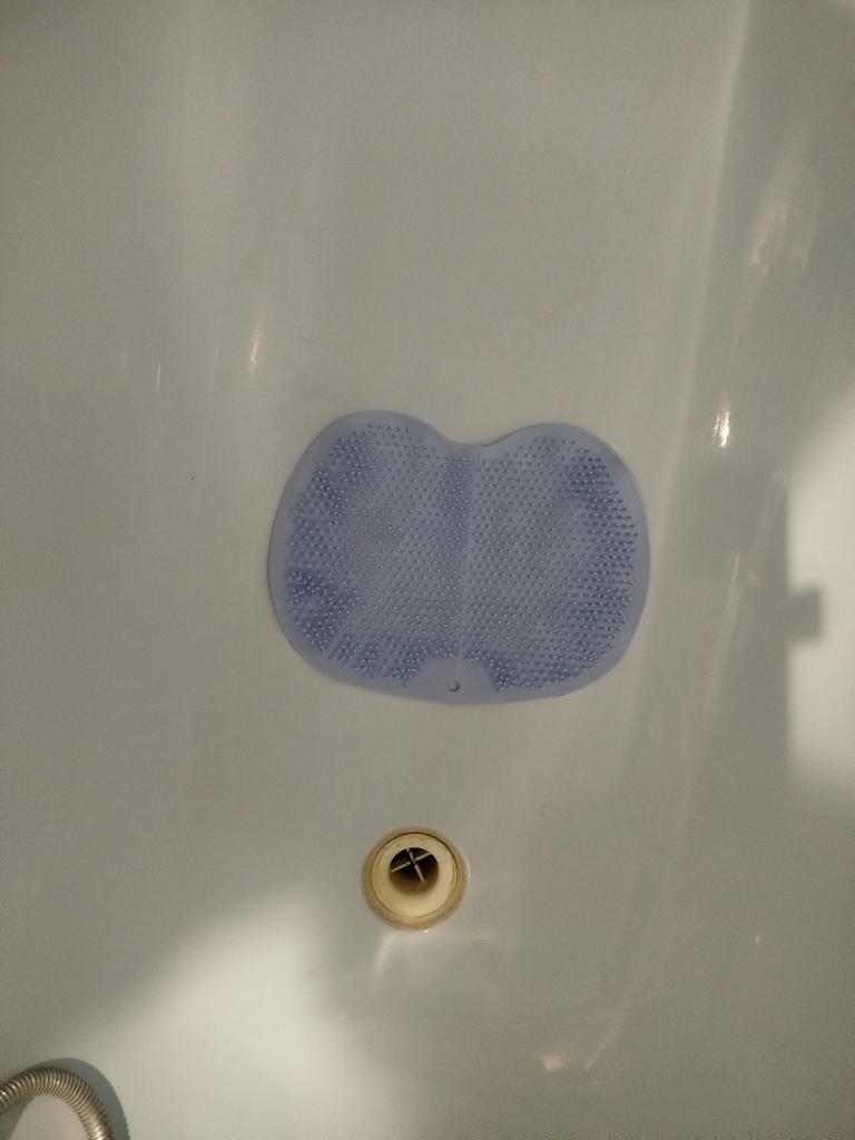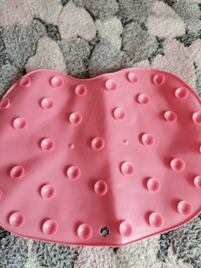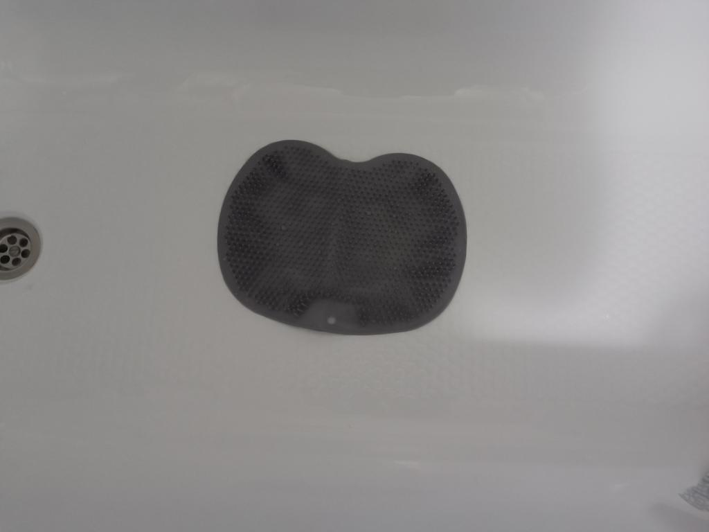 Very small, but otherwise comfortable, adheres well to the bottom of the bathtub.